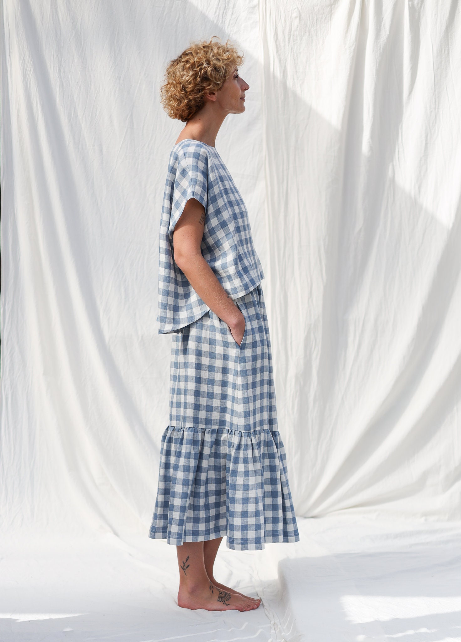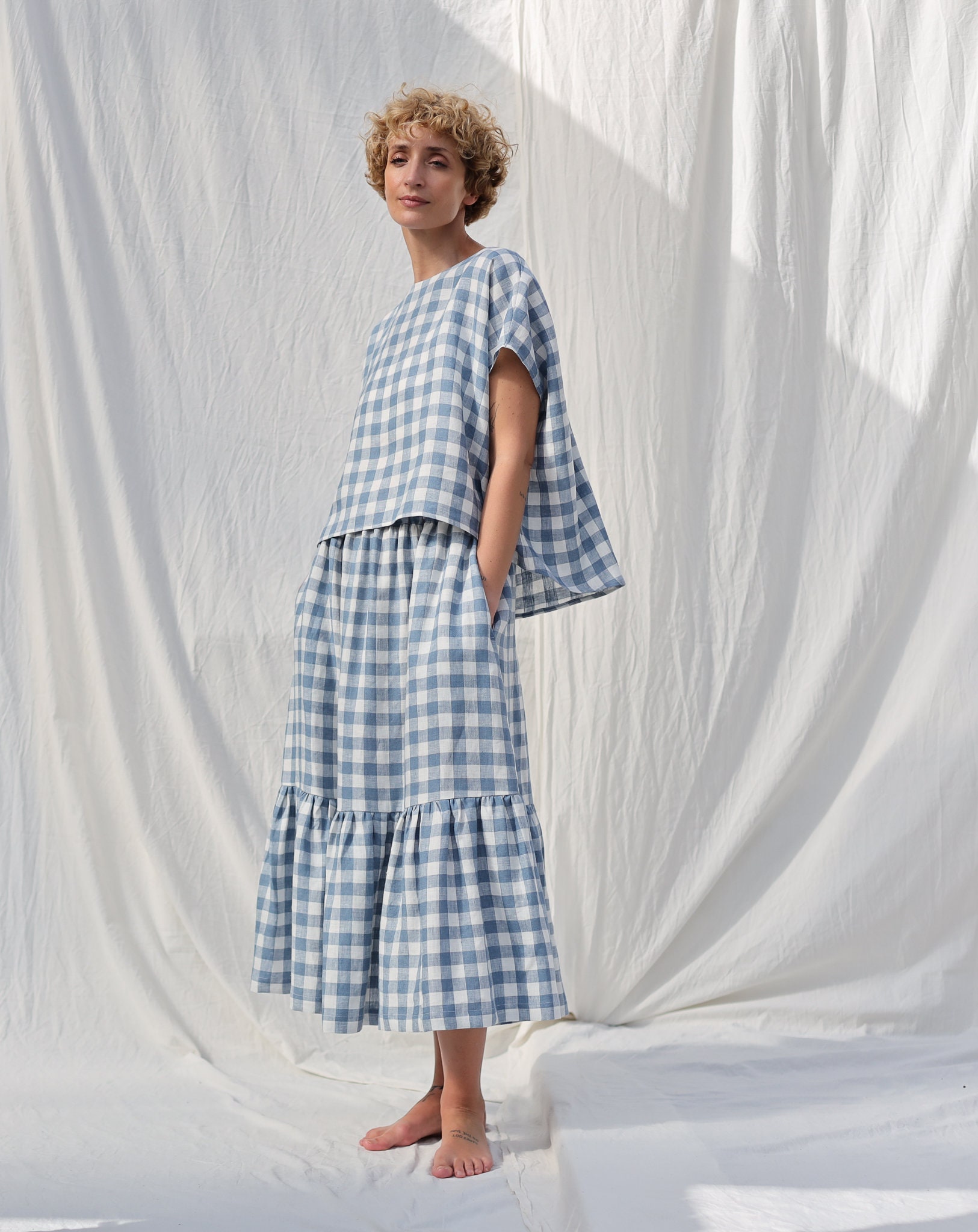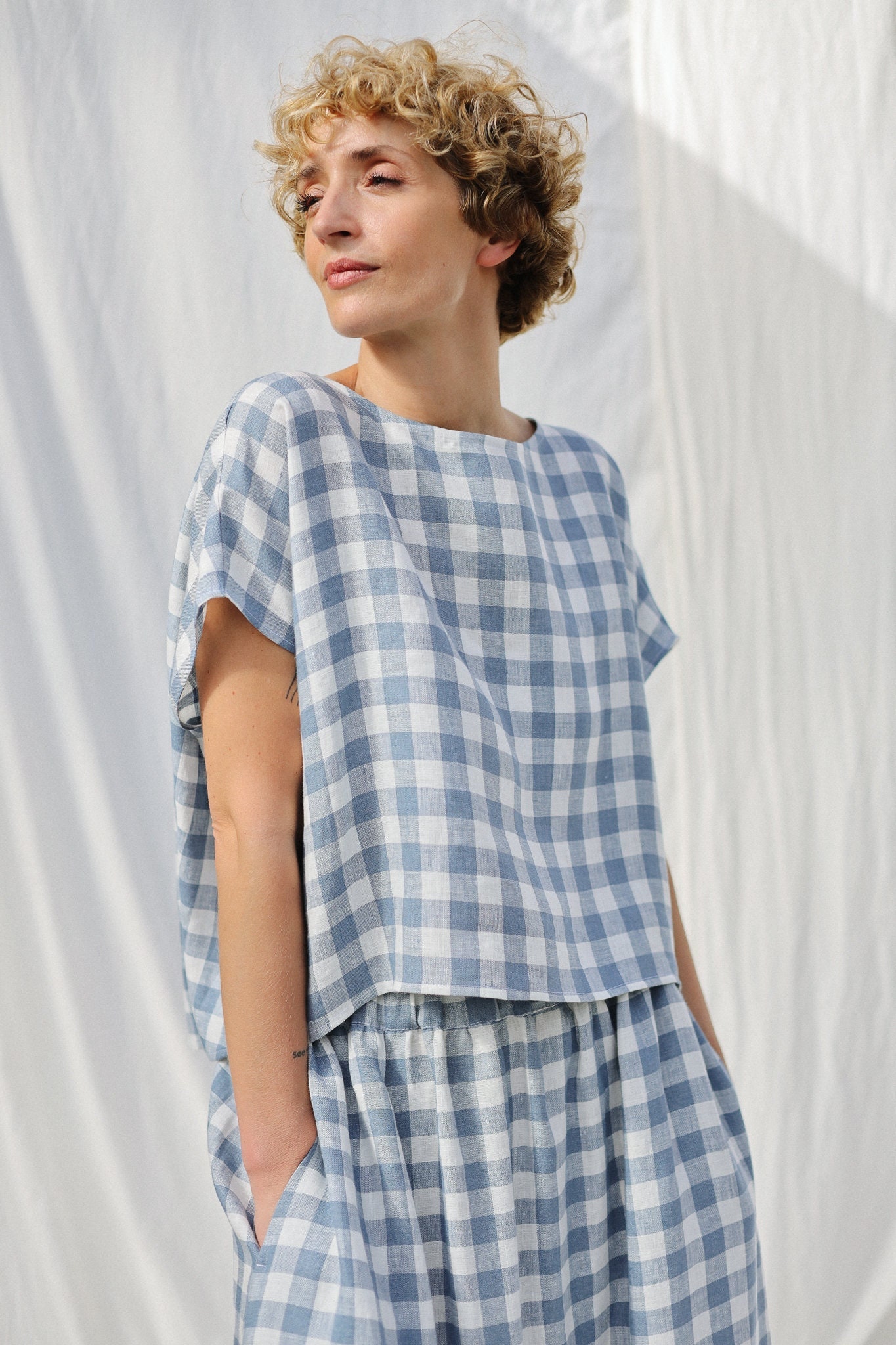 100 % mid-weight pre-washed linen. 100 % Oeko-Tex certified, which means that it meets ecological requirements. It requires very little processing, is is hypoallergenic, and is comfortable and suitable for all seasons.