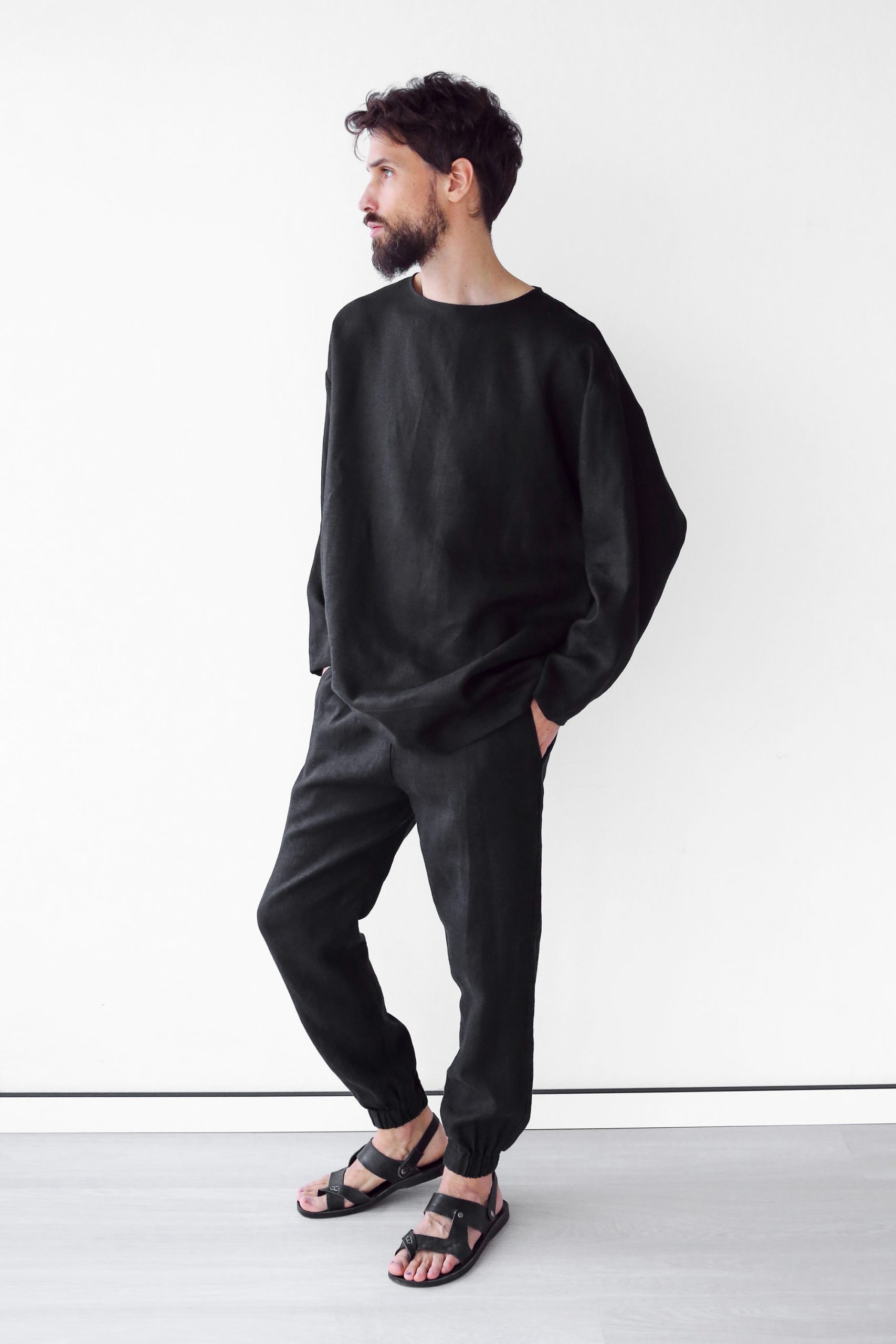 Natural linen. The fabric is natural and takes the body shape, over time it becomes softer. Men’s Linen sweatshirt makes a luxurious and functional gift for that special man in your life.
