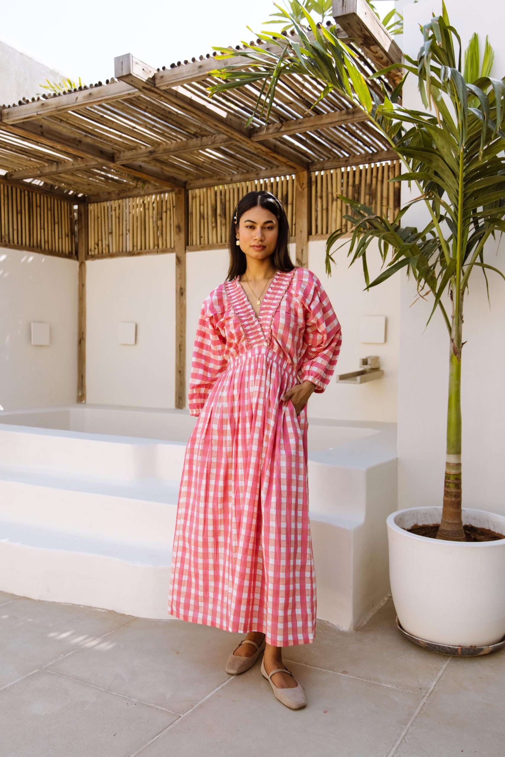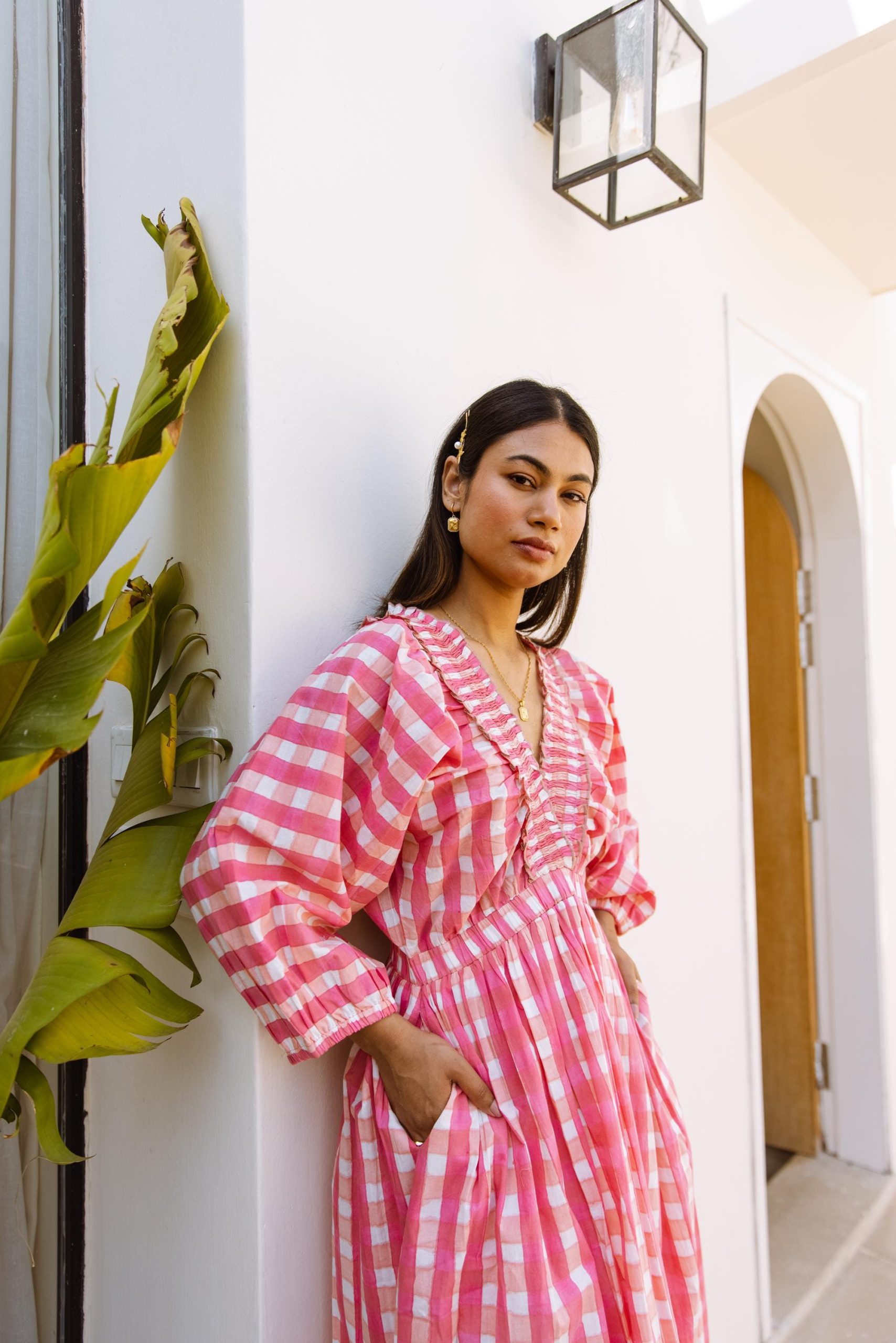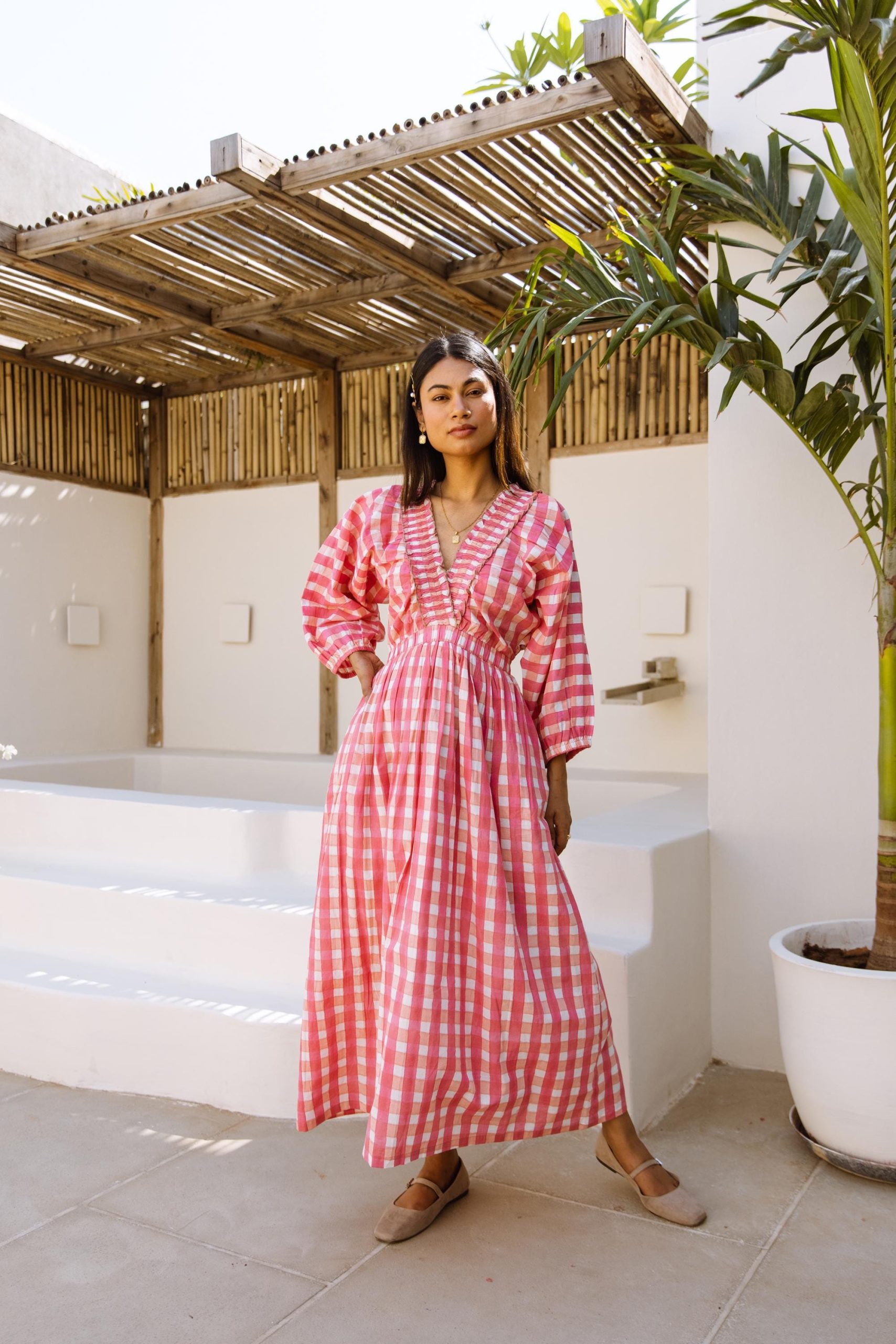 This cotton beauty brings all the joy with its bold block-printed gingham pattern and breezy silhouette. Designed for fun days and good vibes, it’s got pockets, voluminous puff sleeves that make a statement, and a flattering V-neck with a frill detail that adds just the right amount of flirt.