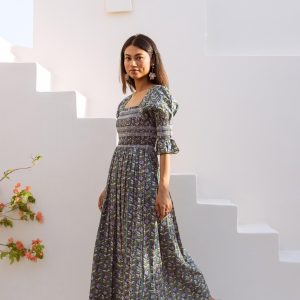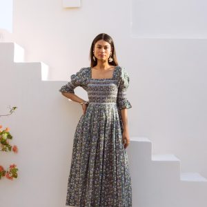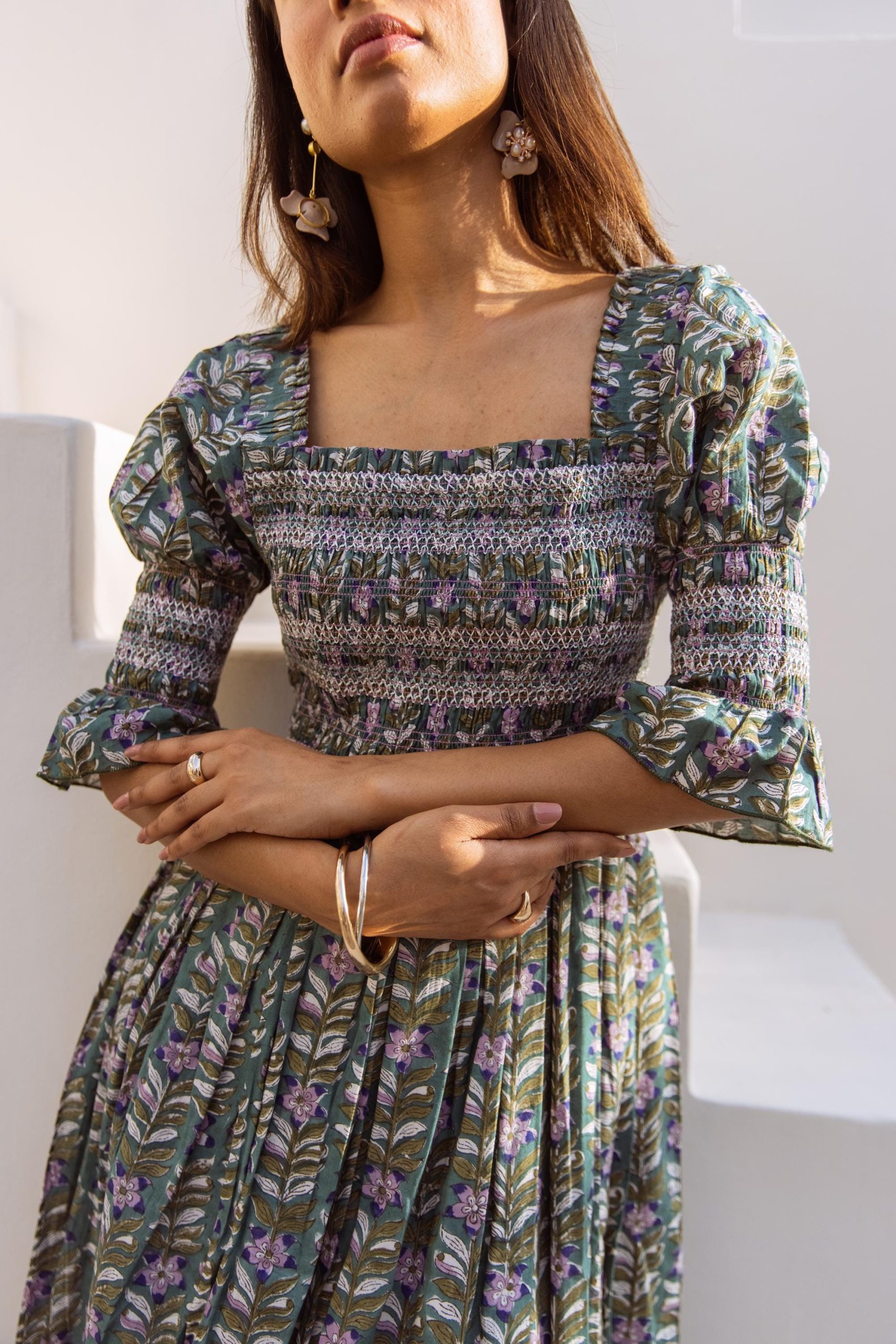 Crafted from breathable cotton and hand block-printed in vibrant, feel-good colors, this one’s made to brighten your day. The body features colorful smocking that hugs just right, while puff sleeves with matching smocked details add a fun, flirty touch. A square neckline keeps it sweet and structured, and yes—it has pockets.